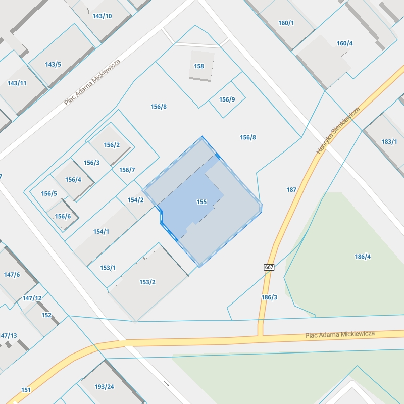 Zobacz przykładowe dane dotyczące Ewidencji Gruntów i Budynków. Działka ewidencyjna urzędu znajduje się przy pl. Mickiewicza