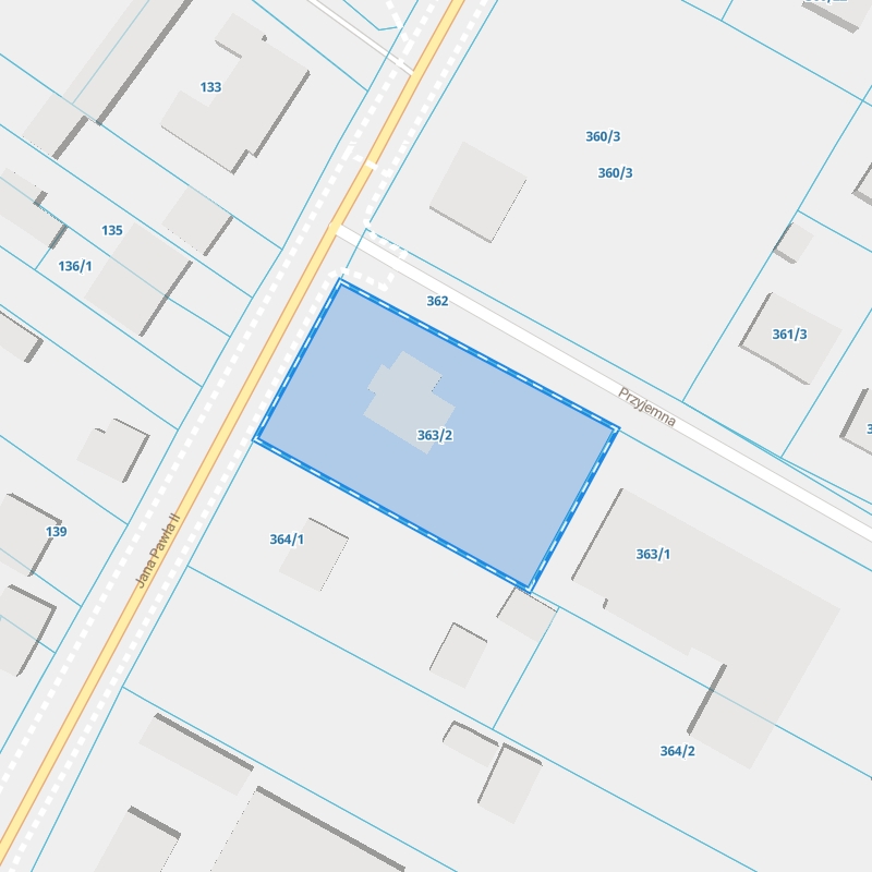 Zobacz przykładowe dane dotyczące Ewidencji Gruntów i Budynków. Działka ewidencyjna urzędu znajduje się przy ul. Jana Pawła II
