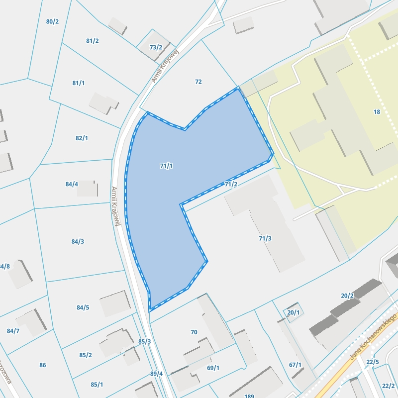 Zobacz przykładowe dane dotyczące Ewidencji Gruntów i Budynków. Działka ewidencyjna urzędu znajduje się przy ul. 1-go Maja