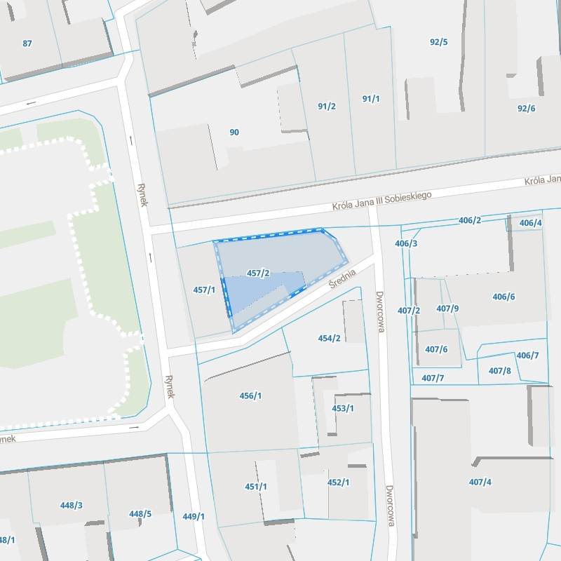 Wyszukaj działkęRyc. 1. Urząd Miejski w Gniewkowie - przykładowy wyrys z Ewidencji Gruntów i Budynków na mapie satelitarnej.