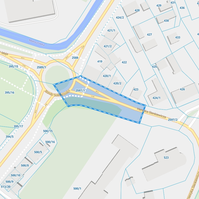 Wyszukaj działkęRyc. 1. Urząd Miasta i Gminy Kazimierza Wielka - przykładowy wyrys z Ewidencji Gruntów i Budynków na mapie satelitarnej.
