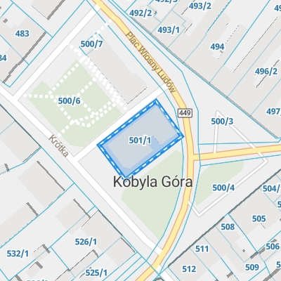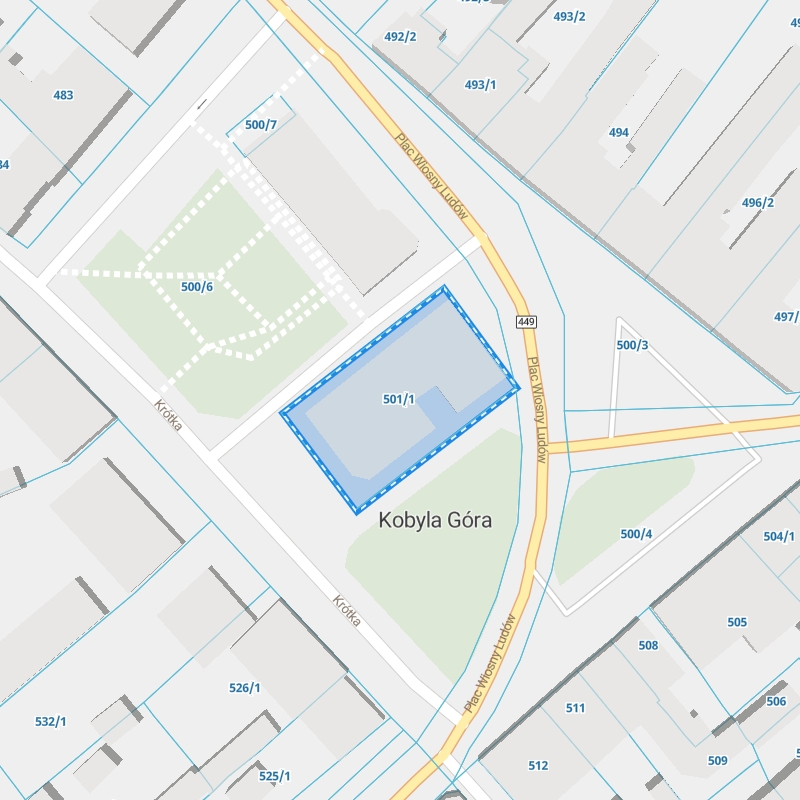 Zobacz przykładowe dane dotyczące Ewidencji Gruntów i Budynków. Działka ewidencyjna urzędu znajduje się przy Plac Wiosny Ludów