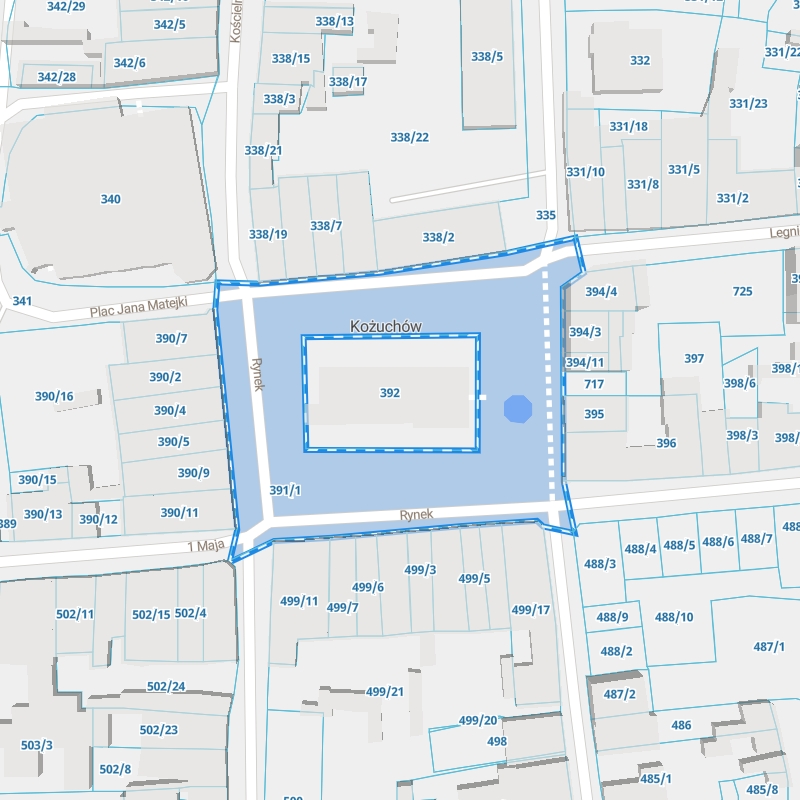 Wyszukaj działkęRyc. 1. Urząd Miejski w Kożuchowie - przykładowy wyrys z Ewidencji Gruntów i Budynków na mapie satelitarnej.