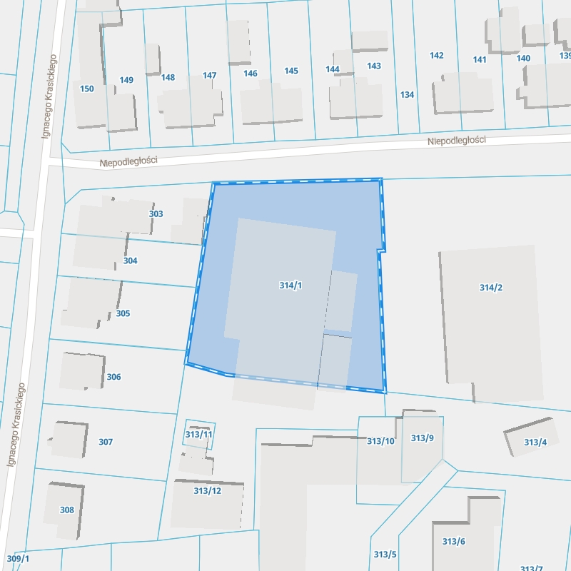 Zobacz przykładowe dane dotyczące Ewidencji Gruntów i Budynków. Działka ewidencyjna urzędu znajduje się przy ul. Stacha Wichury