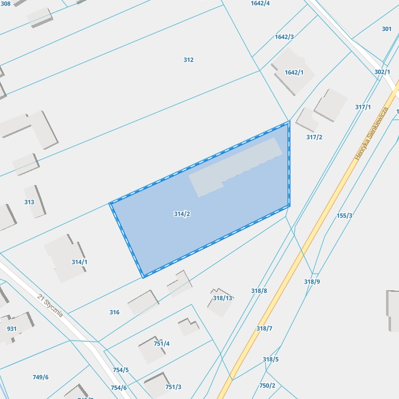 Zobacz przykładowe dane dotyczące Ewidencji Gruntów i Budynków. Działka ewidencyjna urzędu znajduje się przy ul. Grunwaldzka