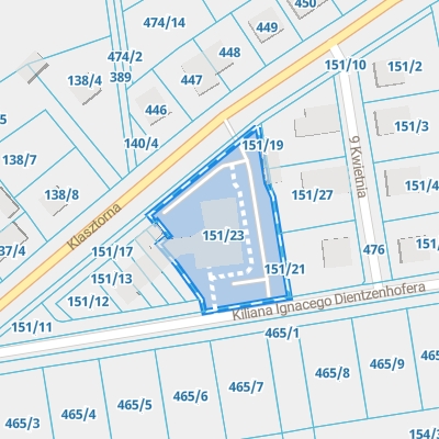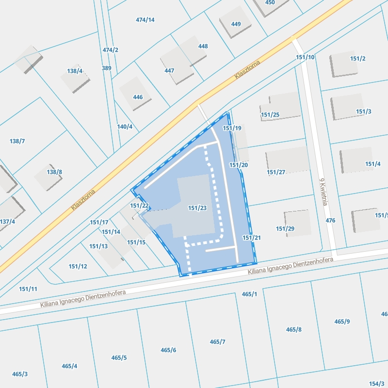 Zobacz przykładowe dane dotyczące Ewidencji Gruntów i Budynków. Działka ewidencyjna urzędu znajduje się przy ul. Kiliana Ignacego Dientzenhofera