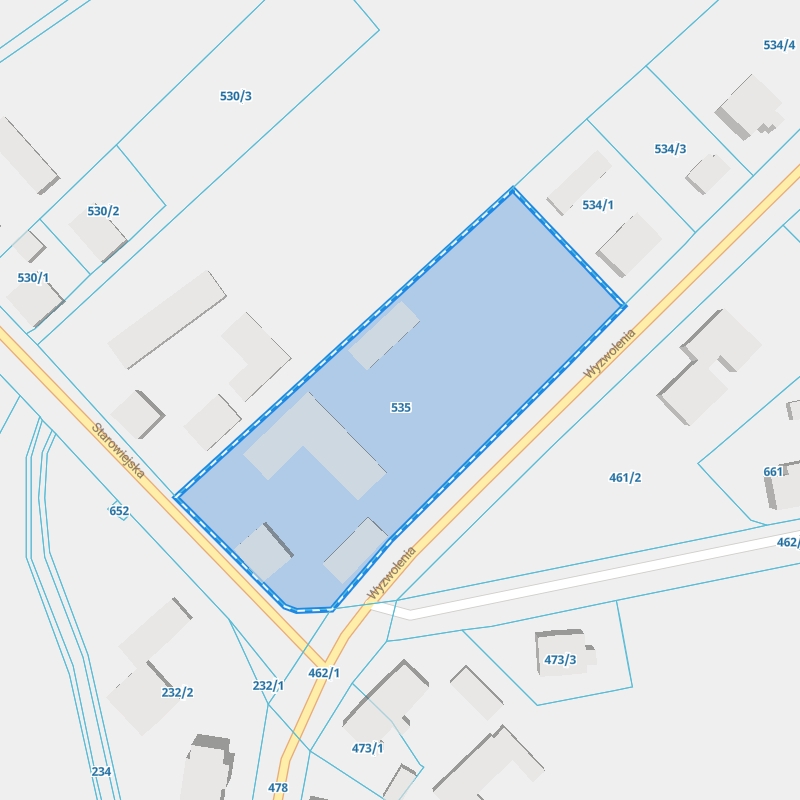 Zobacz przykładowe dane dotyczące Ewidencji Gruntów i Budynków. Działka ewidencyjna urzędu znajduje się przy ul. Dworcowa