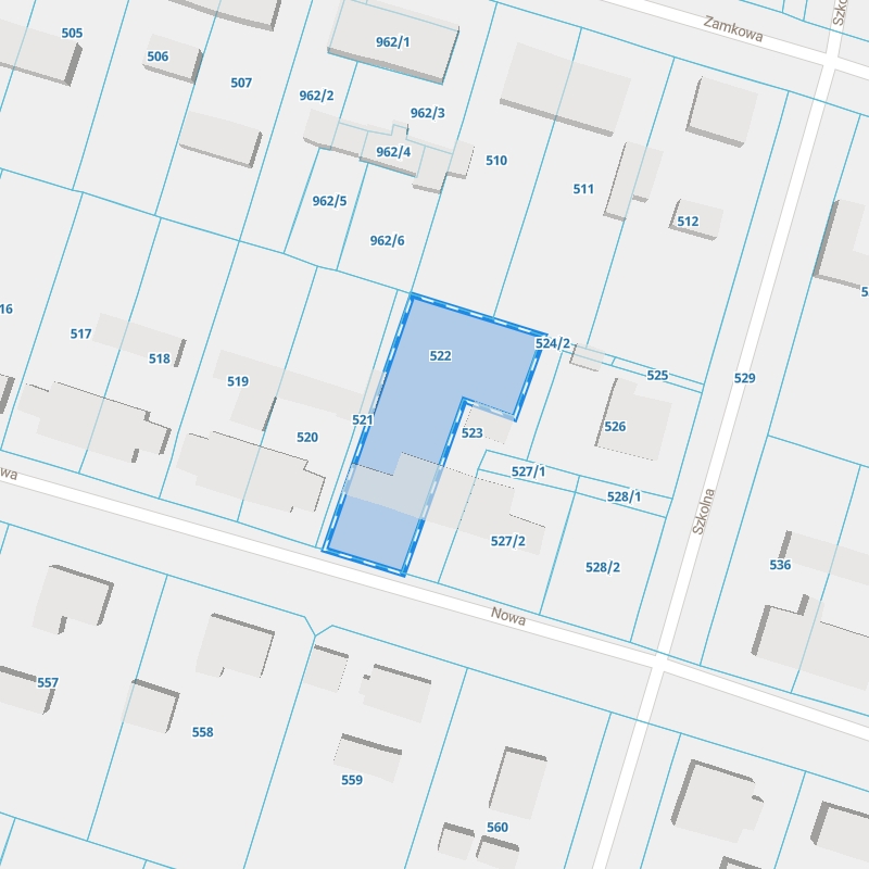 Zobacz przykładowe dane dotyczące Ewidencji Gruntów i Budynków. Działka ewidencyjna urzędu znajduje się przy ul. pl. Wolności