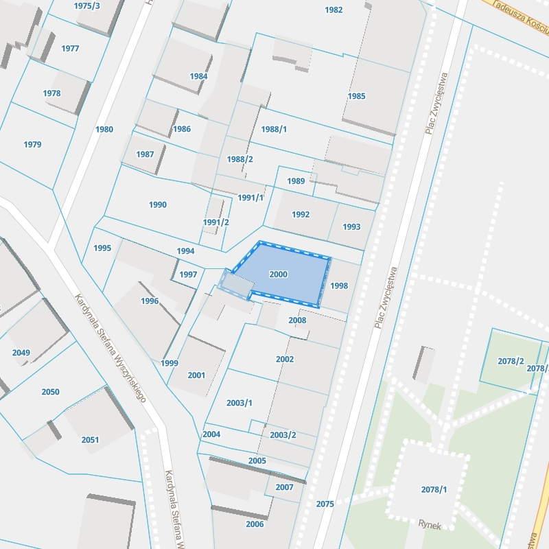 Ryc. 2. Urząd Miasta i Gminy Mordy - granice działki urzędu na podstawie wyrysu z Ewidencji Gruntów i Budynków na mapie podkładowej OpenStreetMap