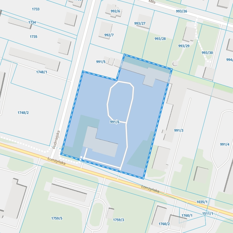 Zobacz przykładowe dane dotyczące Ewidencji Gruntów i Budynków. Działka ewidencyjna urzędu znajduje się przy ul. Łomżyńska