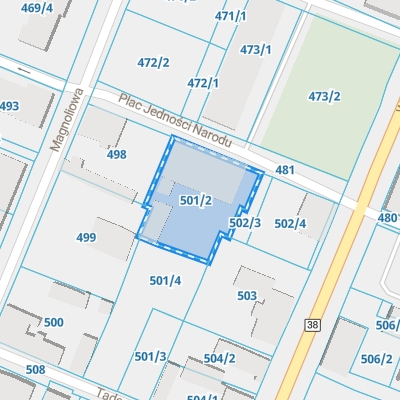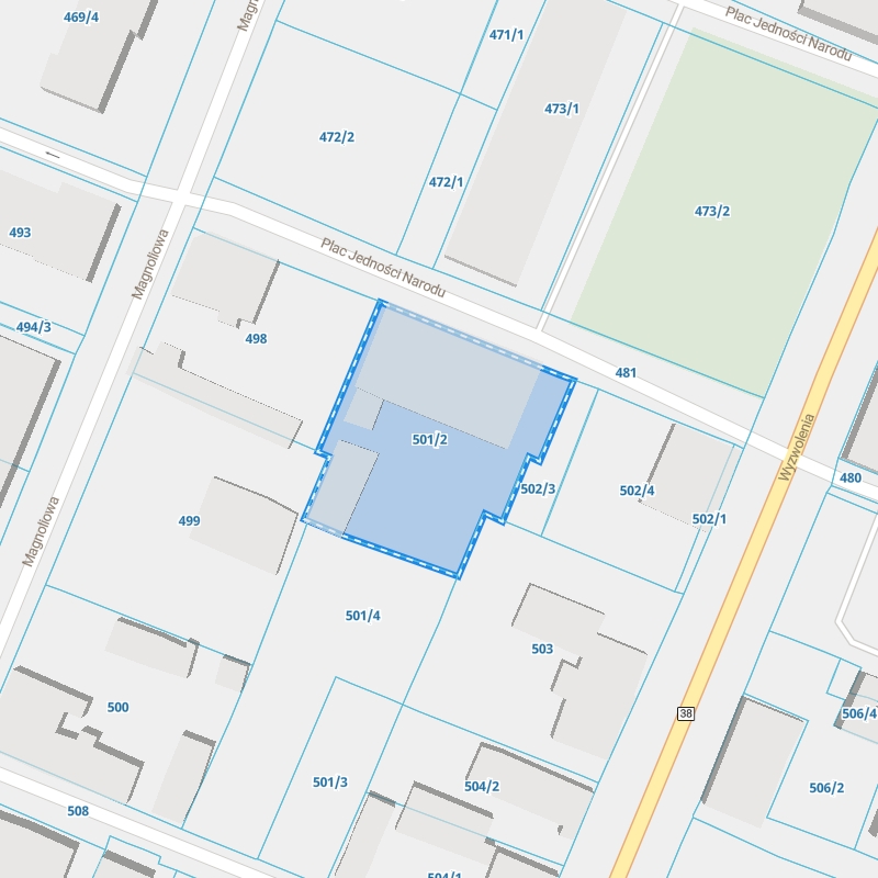 Zobacz przykładowe dane dotyczące Ewidencji Gruntów i Budynków. Działka ewidencyjna urzędu znajduje się przy Pl. Jedności Narodu