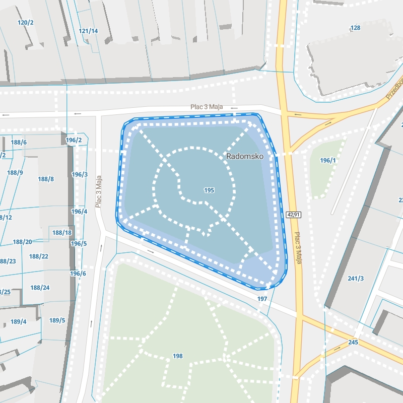 Wyszukaj działkęRyc. 1. Urząd Gminy Radomsko - przykładowy wyrys z Ewidencji Gruntów i Budynków na mapie satelitarnej.