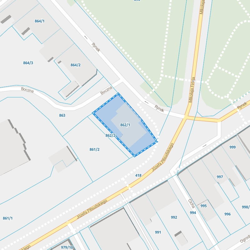 Zobacz przykładowe dane dotyczące Ewidencji Gruntów i Budynków. Działka ewidencyjna urzędu znajduje się przy Rynek