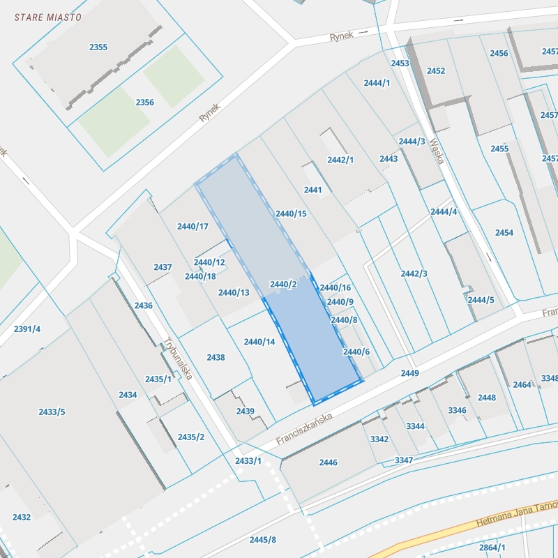Zobacz przykładowe dane dotyczące Ewidencji Gruntów i Budynków. Działka ewidencyjna urzędu znajduje się przy Rynek