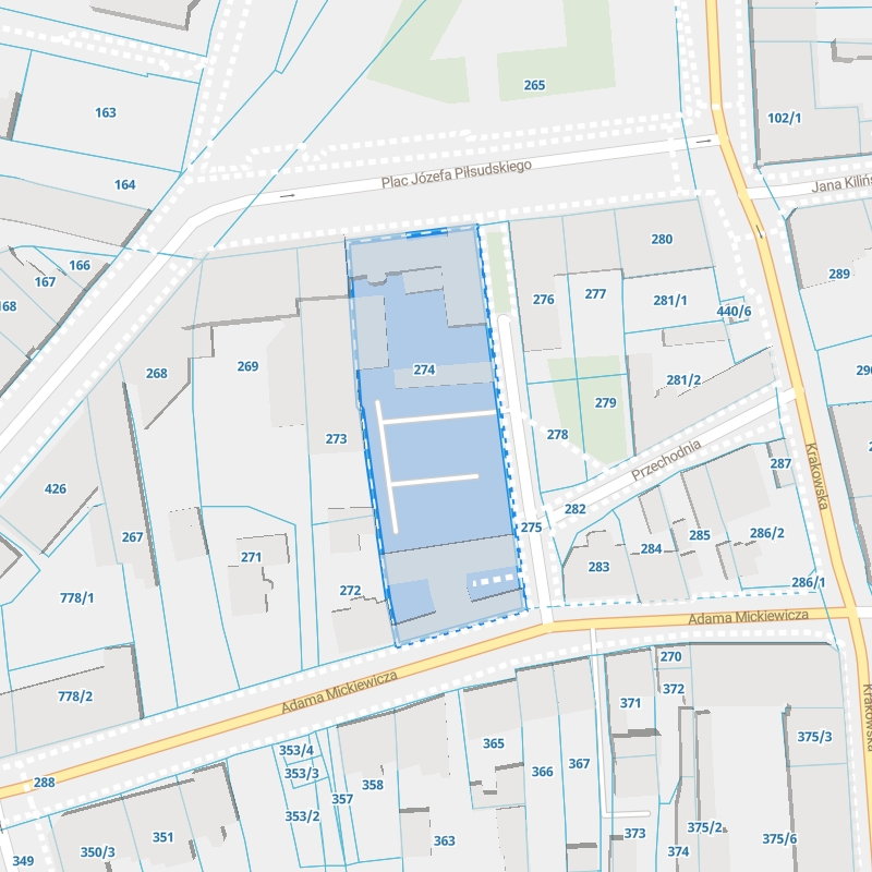 Zobacz przykładowe dane dotyczące Ewidencji Gruntów i Budynków. Działka ewidencyjna urzędu znajduje się przy Pl. Marszałka J. Piłsudskiego