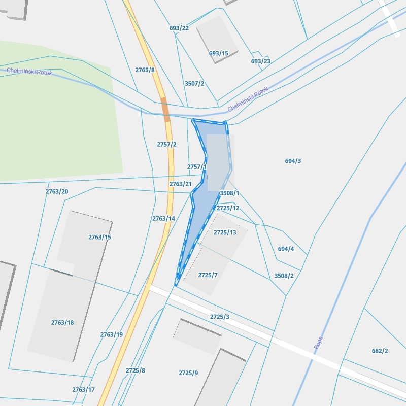 Ryc. 2. Urząd Gminy Ropa - granice działki urzędu na podstawie wyrysu z Ewidencji Gruntów i Budynków na mapie podkładowej OpenStreetMap