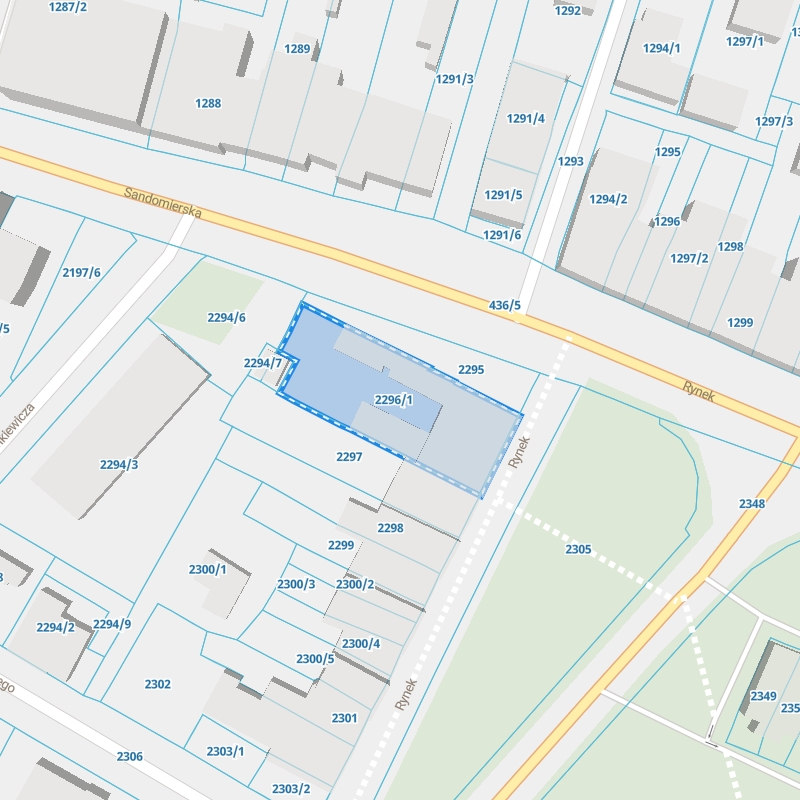 Zobacz przykładowe dane dotyczące Ewidencji Gruntów i Budynków. Działka ewidencyjna urzędu znajduje się przy Rynek