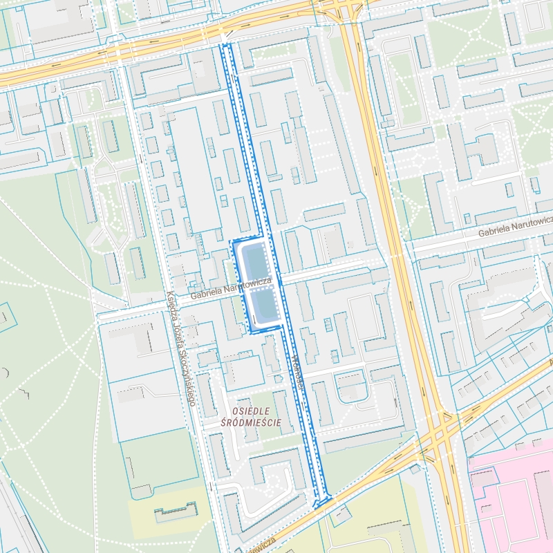 Ryc. 2. Urząd Miasta Stalowej Woli - granice działki oraz położenie urzędu na podstawie wyrysu z Ewidencji Gruntów i Budynków na mapie topograficznej OpenStreetMap