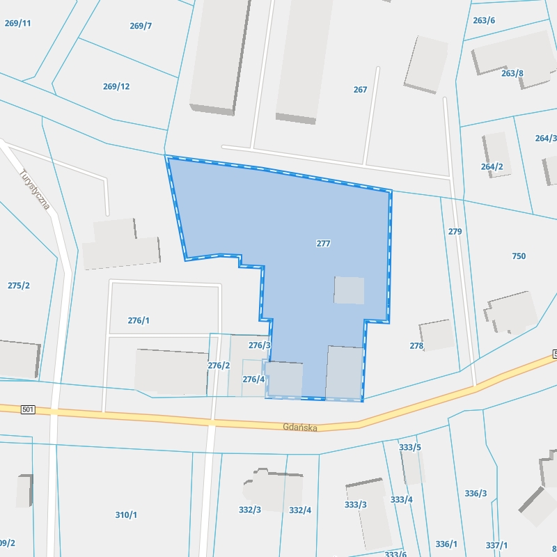 Zobacz przykładowe dane dotyczące Ewidencji Gruntów i Budynków. Działka ewidencyjna urzędu znajduje się przy ul. Gdańska