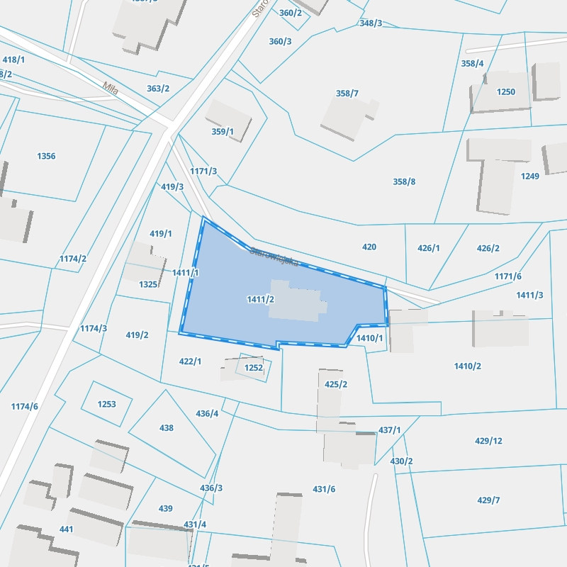 Ryc. 2. Urząd Gminy Tomice - granice działki urzędu na podstawie wyrysu z Ewidencji Gruntów i Budynków na mapie podkładowej OpenStreetMap