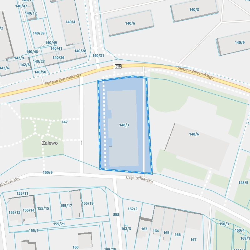 Zobacz przykładowe dane dotyczące Ewidencji Gruntów i Budynków. Działka ewidencyjna urzędu znajduje się przy ul. Częstochowska