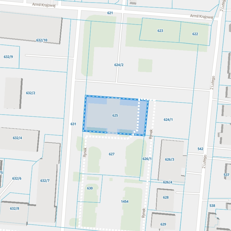 Zobacz przykładowe dane dotyczące Ewidencji Gruntów i Budynków. Działka ewidencyjna urzędu znajduje się przy Rynek