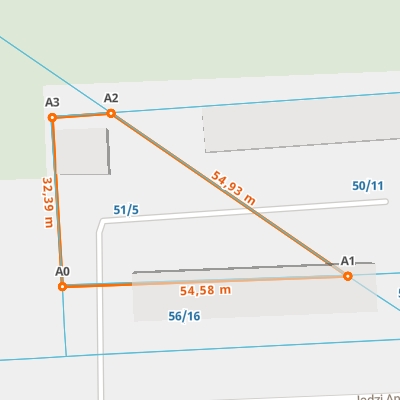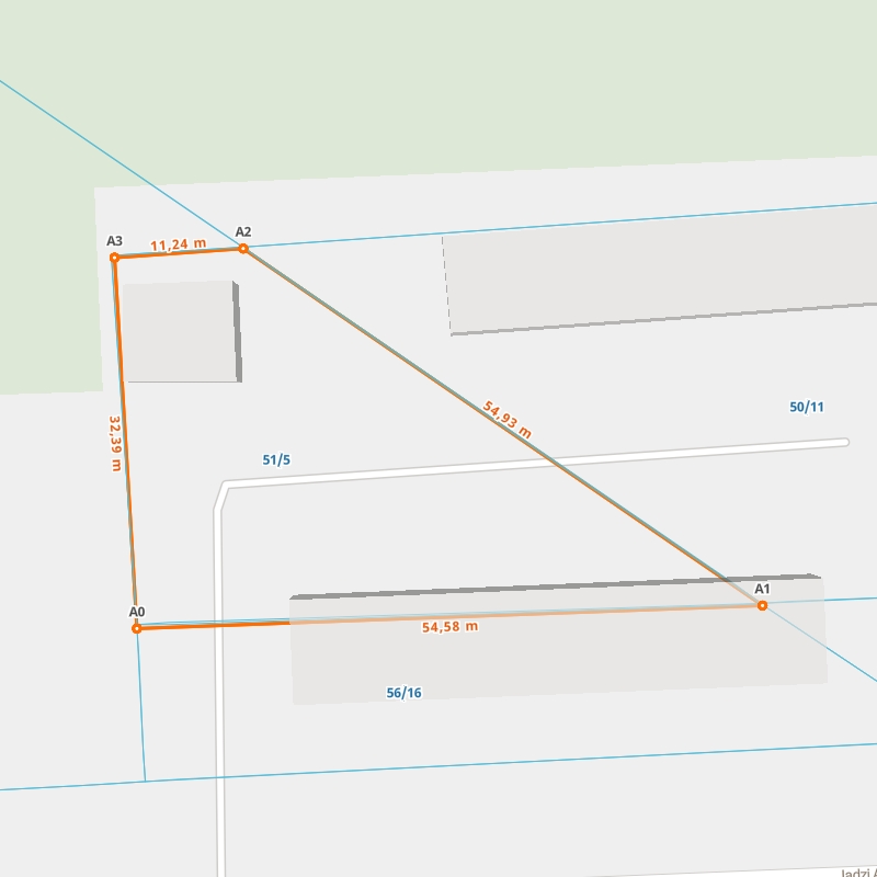 | A0 ← 51.74815288, 19.53540281 | A1 | 54,58 m |