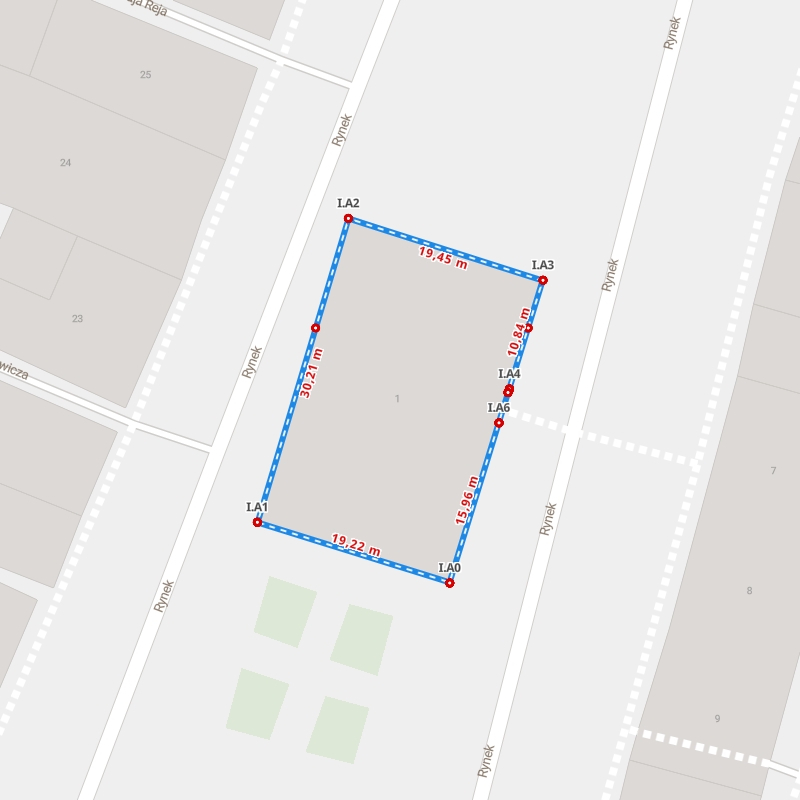 Ryc. 1. Parametry geometryczne terenu. Wymiary działki na kórej znajduje się Urząd Miejski w Byczynie