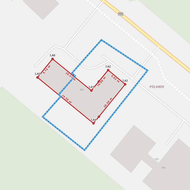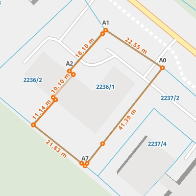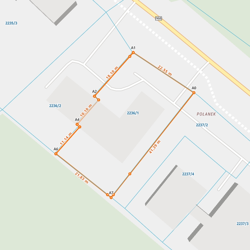 | A0 ← 49.57516367, 20.34317825 | A1 | 22,55 m |