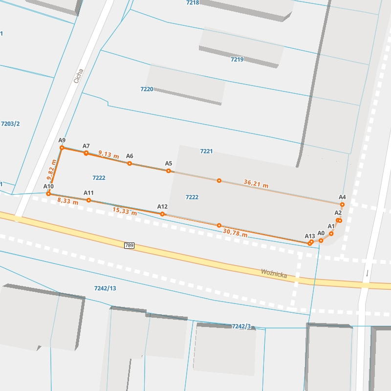 | A12 ← 50.59763404, 19.16033523 | A13 | 30,78 m |