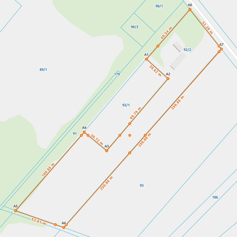 | A0 ← 52.03214185, 18.98736043 | A1 | 69,54 m |