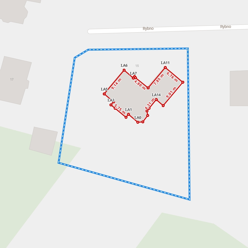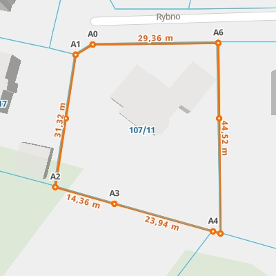Przykładowe informacje z raportu o działce na której znajduje się Urząd Gminy Rybno dotyczące wymiarów działki oraz budynków znajdujących się na działce.