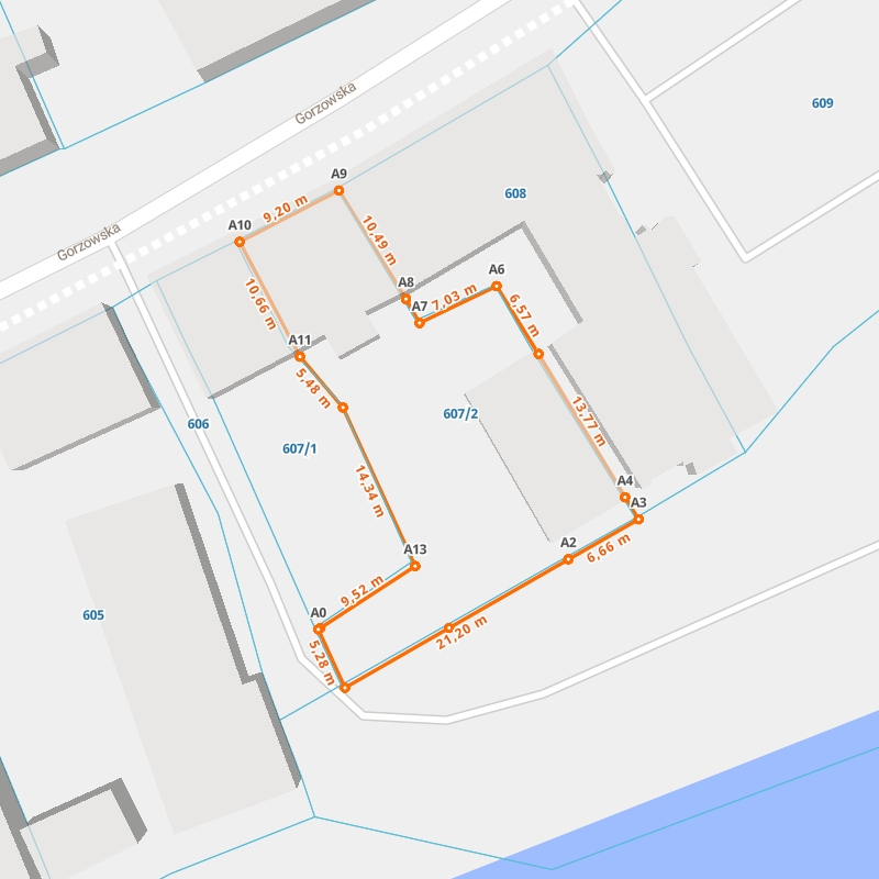 Przykładowe informacje z raportu o działce na której znajduje się Urząd Gminy Santok dotyczące wymiarów działki oraz budynków znajdujących się na działce.