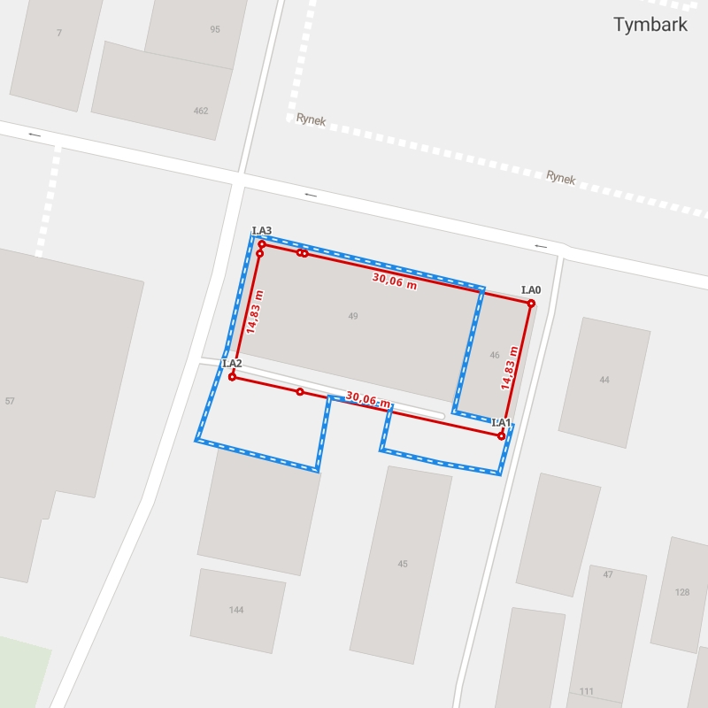 Ryc. 1. Parametry geometryczne terenu. Wymiary działki na kórej znajduje się Urząd Gminy w Tymbarku