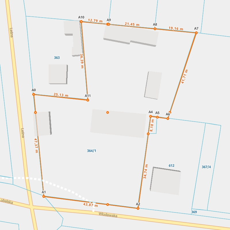 | A0 ← 51.26263447, 23.30872149 | A1 | 47,37 m |