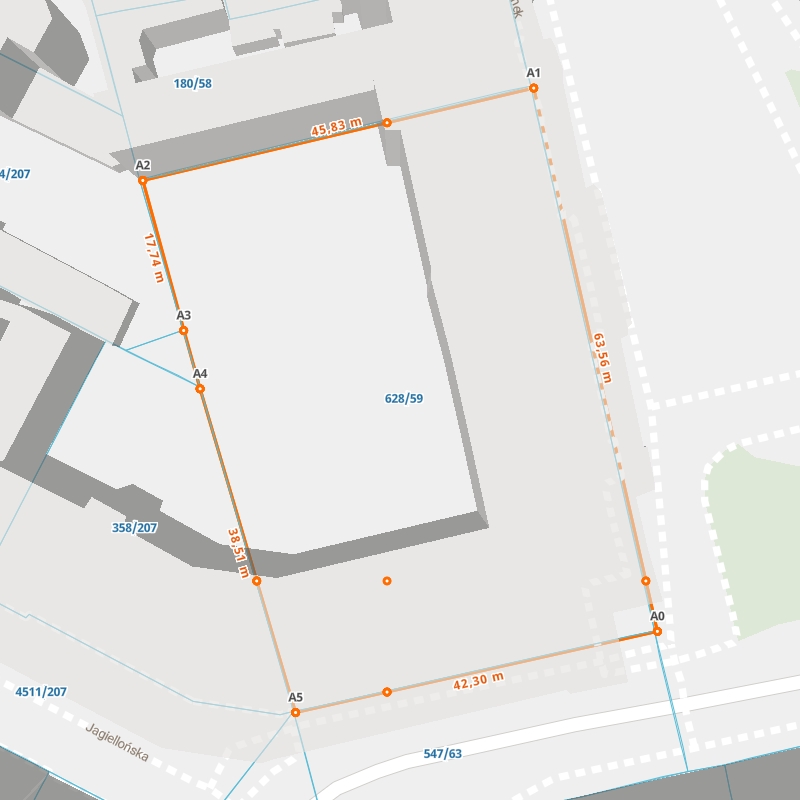 | A0 ← 50.29740301, 18.95356629 | A1 | 63,56 m |