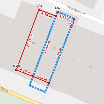 Ryc. 1. Parametry geometryczne terenu. Wymiary działki na kórej znajduje się Urząd Miejski w Woźnikach