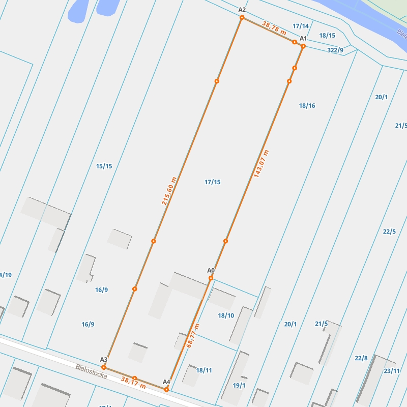 | A3 ← 53.17288113, 23.04424358 | A4 | 38,17 m |